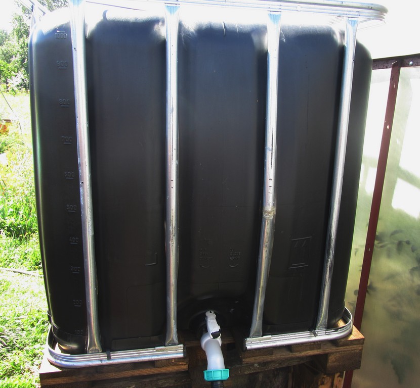 Для капитальной системы полива дачи и огорода мы купили б / у кубовик из черного светонепроницаемого пластика. Лучшим считается импортный еврокуб 1000 л в металлической обрешетке. В принципе для хранения воды подойдет бочка или резервуар, но мы всегда используем еврокубы.